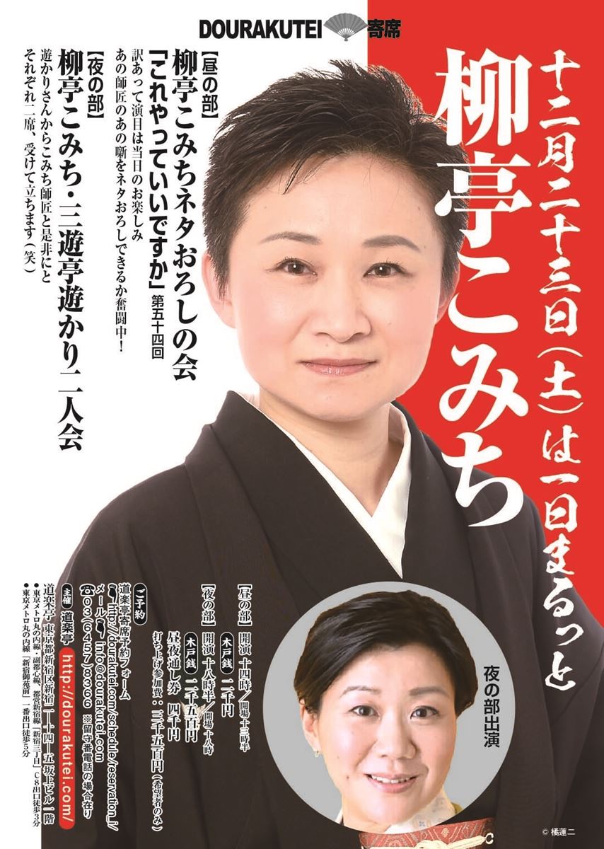 12月23日(土) は1日まるっと柳亭こみち 23/12/23(土) 道楽亭(Ryu's Bar) シェア ツイート 上演情報 ジャンル 落語/演芸 【昼の部】柳亭こみちネタおろしの会「これやっていいですか」第54回【夜の部】柳亭こみち・三遊亭遊かり二人会「暑苦しいのはいかが」 料金 昼の部:2,000円夜の部:2,500円昼夜通し:4,000円 キャスト&スタッフ 出演 柳亭こみち 三遊亭遊かり お問い合わせ 道楽亭 公式サイト シェア ツイート