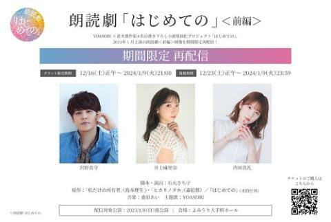 朗読劇『はじめての』<前編> 23/12/23(土)~24/1/9(火) PIA LIVE STREAM シェア ツイート 上演情報 ジャンル 小劇場 こちらのチケットをご購入いただくとオンライン動画配信をご覧いただけます。配信時間は予定のため変更の可能性あり。【視聴に関するご不明点は下記をご確認ください】 料金 配信チケット-3,500円 表示できるチケット情報はありません詳しくはこちら キャスト&スタッフ 出演 宮野真守 井上麻里奈 内田真礼 [出演]宮野真守 / 井上麻里奈 / 内田真礼 お問い合わせ PIA LIVE STREAMサイト ヘルプ 視聴に関するご不明点の確認 シェア ツイート