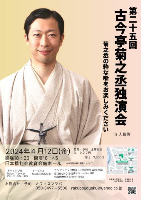 第25回 古今亭菊之丞独演会in人形町 24/4/12(金) 日本橋社会教育会館 シェア ツイート 人気の噺家 古今亭菊之丞の恒例の人形町での独演会です 上演情報 ジャンル 落語/演芸 料金 前売-3,000円当日-3500円 表示できるチケット情報はありません詳しくはこちら キャスト&スタッフ 出演 古今亭菊之丞 [出演]古今亭菊之丞 お問い合わせ オフィスマツバ 公式サイト シェア ツイート