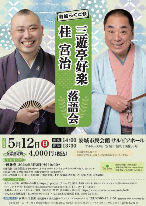 安城らくご会 三遊亭好楽・桂宮治 落語会 24/5/12(日) 安城市民会館 サルビアホール シェア ツイート 人気落語家「三遊亭好楽」と「桂宮治」が贈る落語会! 上演情報 ジャンル 落語/演芸 未就学児童は入場不可。 料金 一般-4,000円 全席指定 表示できるチケット情報はありません詳しくはこちら キャスト&スタッフ 出演 三遊亭好楽 桂宮治 [出演]三遊亭好楽 / 桂宮治 お問い合わせ 安城市民会館 シェア ツイート