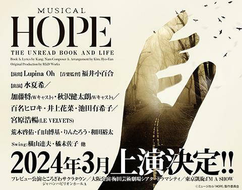 Musical『HOPE』 THE UNREAD BOOK AND LIFE 24/3/16(土)~24/3/31(日) 梅田芸術劇場シアター・ドラマシティ、ところざわサクラタウン ジャパンパビリオン ホールA、I'M A SHOW シェア ツイート 上演情報 ジャンル ミュージカル 未就学児童は入場不可。出演予定の涼風真世は体調不良により降板。「HOPE」役として、3月16日(土)は水夏希、17日(日)は橘未佐子が出演。 料金 【埼玉公演】一般--12,800円一般(当日引換券)-12,800円【大阪公演】一般-13,800円一般(当日引換券)-13,800円【東京公演】一般-13,800円 全席指定 表示できるチケット情報はありません詳しくはこちら キャスト&スタッフ 出演 涼風真世 加藤将之 百名ヒロキ 井上花菜 池田有希子 宮原浩暢 荒木啓佑 白山博基 りんたろう 和田裕太 横山達夫 橘未佐子 秋沢健太朗 水夏希 演出 オ・ルピナ お問い合わせ atlas キョードーインフォメーション (大阪公演) Musical『HOPE』 12:00~18:00・土日祝休 公式サイト シェア ツイート