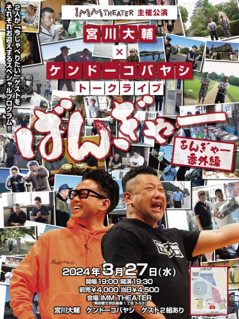 あんぎゃー番外編 宮川大輔×ケンドーコバヤシ トークライブ『ばんぎゃー』 24/3/27(水) IMM THEATER シェア ツイート 上演情報 ジャンル お笑い 18歳未満、高校生入場不可。身分証明書を確認させていただくことがございますので、必ずご持参いただくようお願いします。確認ができない場合は、入場をお断りさせていただくことがございます。 料金 一般-4,000円 全席指定車椅子席の方は、チケットご購入前に FANYチケット問合せダイヤルまで要問合せ 表示できるチケット情報はありません詳しくはこちら キャスト&スタッフ 出演 宮川大輔 ケンドーコバヤシ [出演]宮川大輔 / ケンドーコバヤシ お問い合わせ FANYチケット問合せダイヤル 10:00~19:00 公式サイト シェア ツイート