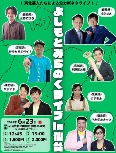 よしもとみちのくライブin仙台 24/6/23(日) 仙台市戦災復興記念館 研修室 シェア ツイート 上演情報 ジャンル お笑い 5歳以上は有料。4歳以下はひざ上のみ無料、但し、お席が必要な場合は有料。車いす席の販売はございません。 料金 一般-1,500円 全席自由 表示できるチケット情報はありません詳しくはこちら キャスト&スタッフ 出演 ソラシド ぺんぎんナッツ バクコメ お野菜太郎 けせんぬまペイ! 北野ごぼう ゆずさん [出演]ソラシド / ぺんぎんナッツ / バクコメ / お野菜太郎 / けせんぬまペイ! / 北野ごぼう / ゆずさん お問い合わせ FANYチケット問合せダイヤル 公式サイト シェア ツイート