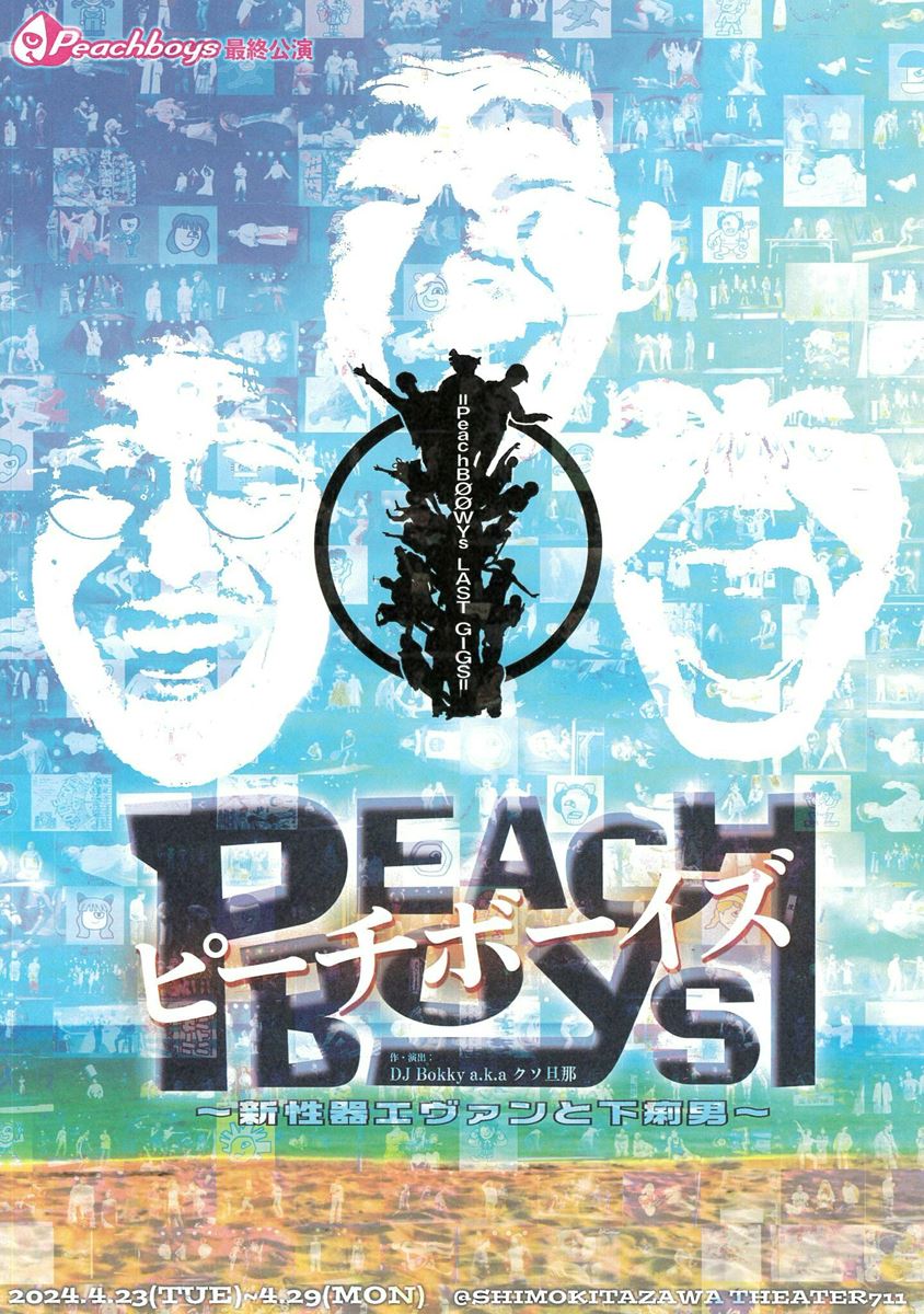 Peachboys『ピーチボーイズ~新性器エヴァンと下痢男~』 24/4/23(火)~24/4/29(月) シアター711 シェア ツイート 上演情報 ジャンル 小劇場 料金 祭前かぶりつき-5,500円自由席一般-3,800円自由席ペア割-7,000円 祭前かぶりつき:最前列、豪華特典付き キャスト&スタッフ [作・演出]DJ Bokky a.k.a クソ旦那 [出演]GO / KYOKYO / KYOSUKE / 他※回替わりゲストあり。詳細は公式サイトをご確認ください お問い合わせ Peachboys Peachboys 公式サイト シェア ツイート