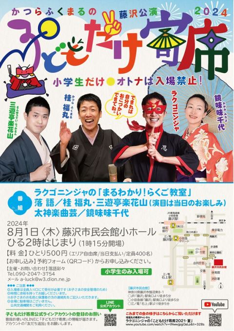 かつらふくまるの子どもだけ寄席~藤沢 24/8/1(木) 藤沢市民会館 小ホール シェア ツイート 全国でリピーター続出の、小学生だけが入れる落語会 上演情報 ジャンル 落語/演芸 ※小1~小6の方のみ入場可能です(大人は入れません)※終演は15時30分頃予定です。お迎えをお願いします※未就学児の方のご入場はご遠慮いただいております 料金 小学生-500円 全席指定小1~小6のみ入場可能 表示できるチケット情報はありません詳しくはこちら キャスト&スタッフ 出演 桂福丸 ラクゴニンジャ 三遊亭楽花山 鏡味味千代 [出演]桂福丸 / ラクゴニンジャ / 三遊亭楽花山 / 鏡味味千代 お問い合わせ 落語彩々(落語家 桂福丸) 公式サイト シェア ツイート