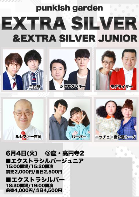 「【パンキッシュガーデン】エクストラシルバー」 24/6/4(火) 座・高円寺2 シェア ツイート 上演情報 ジャンル お笑い 未就学児童は入場不可。車椅子での来場は事前に問合せ先まで要連絡。 料金 【15:30公演】一般-2,000円【19:00開演】一般-4,000円 全席指定当日+500円 表示できるチケット情報はありません詳しくはこちら キャスト&スタッフ 出演 三四郎 ルシファー吉岡 ジグザグジギー モグライダー パーパー ニッチェ カゲヤマ スタミナパン ファイヤーサンダー [出演]三四郎 / ルシファー吉岡 / ジグザグジギー / モグライダー / パーパー / ニッチェ お問い合わせ マセキ芸能社 公式サイト シェア ツイート