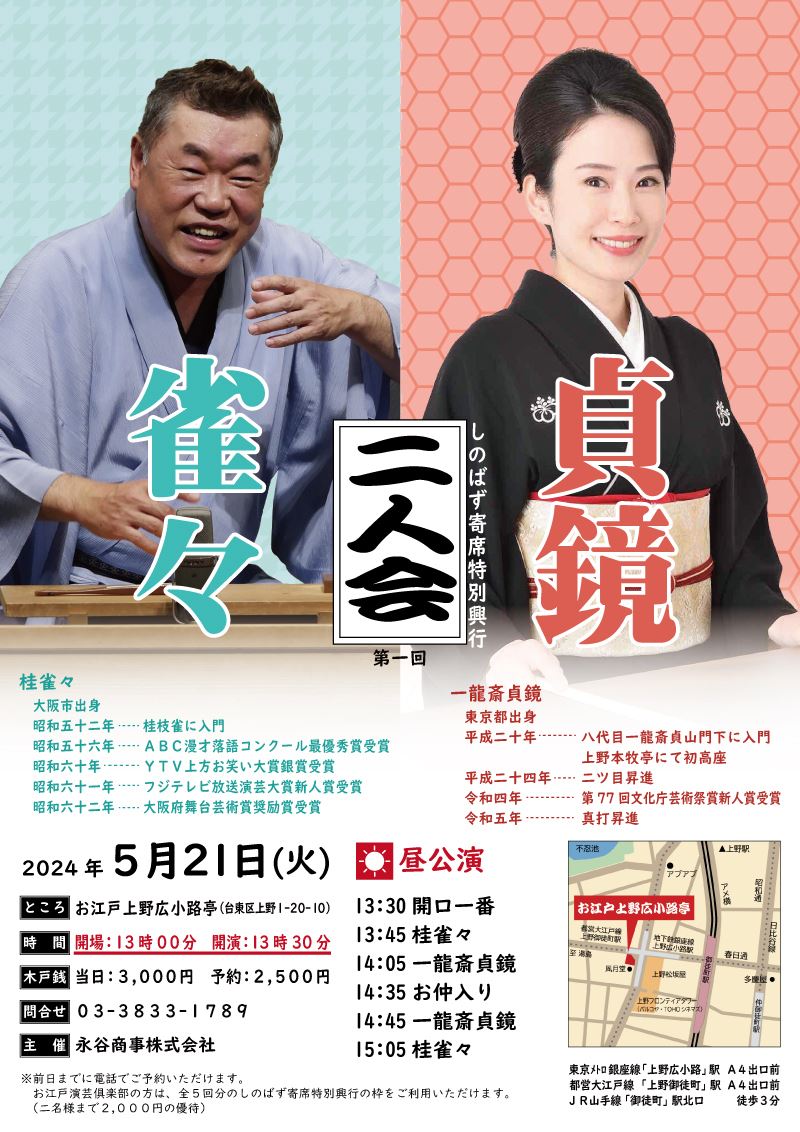 雀々・貞鏡 二人会 24/5/21(火) お江戸上野広小路亭 シェア ツイート 上演情報 ジャンル 落語/演芸 料金 当日:3,000円予約:2,500円 キャスト&スタッフ 出演 桂雀々 一龍斎貞鏡 お問い合わせ お江戸上野広小路亭 公式サイト シェア ツイート