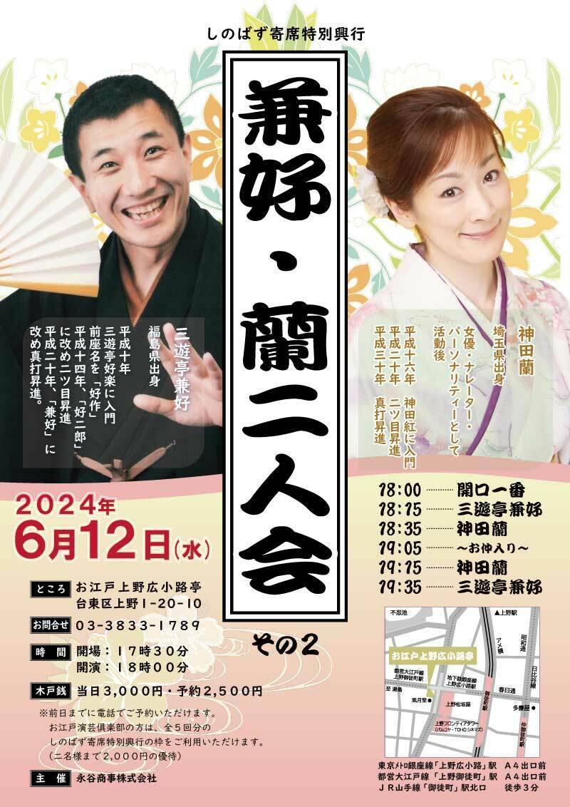 兼好・蘭 二人会 24/6/12(水) お江戸上野広小路亭 シェア ツイート 上演情報 ジャンル 落語/演芸 料金 当日:3,000円予約:2,500円 キャスト&スタッフ 出演 三遊亭兼好 神田蘭 お問い合わせ お江戸上野広小路亭 公式サイト シェア ツイート