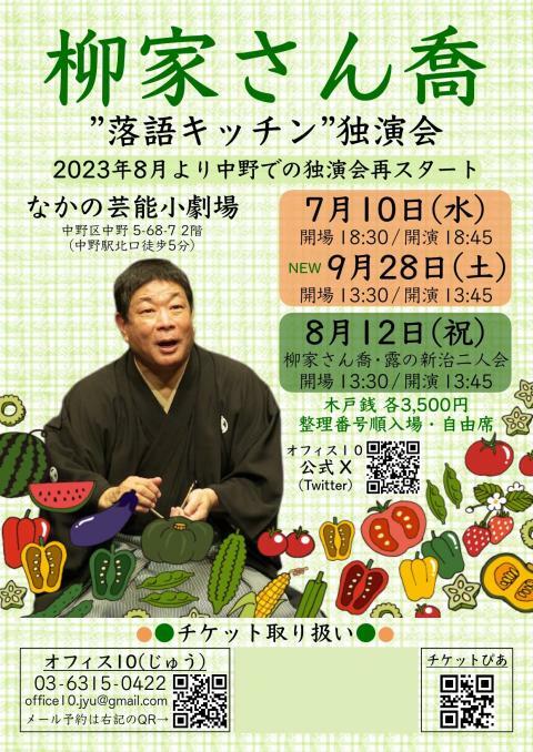柳家さん喬"落語キッチン"独演会 24/7/10(水) なかの芸能小劇場 シェア ツイート 上演情報 ジャンル 落語/演芸 チケットに記載の整理番号順に入場で、自由席となります。 料金 一般-3,500円 全席自由・整理番号付 表示できるチケット情報はありません詳しくはこちら キャスト&スタッフ 出演 柳家さん喬 [出演]柳家さん喬 お問い合わせ オフィス10 公式サイト シェア ツイート