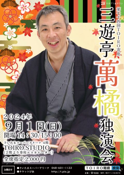 三遊亭萬橘独演会 24/9/1(日) TOIRO(たまアリ△タウン) シェア ツイート 上演情報 ジャンル 落語/演芸 未就学児のご入場はご遠慮ください。 料金 一般-2,000円 全席指定 表示できるチケット情報はありません詳しくはこちら キャスト&スタッフ メイン 三遊亭萬橘 お問い合わせ さいたまスーパーアリーナ 公式サイト シェア ツイート