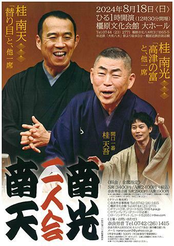 桂南光南天二人会 24/8/18(日) 奈良県橿原文化会館 大ホール シェア ツイート 上演情報 ジャンル 落語/演芸 未就学児童は入場不可。本公演は隣席との空間を空けずにお座りいただくお席と、空間を空けてお座りいただくお席がございます。予めご了承ください。 料金 S席-3,400円 A席-2,400円 表示できるチケット情報はありません詳しくはこちら キャスト&スタッフ 出演 桂南光 桂南天 桂天吾 [出演]桂南光(「高津の富」他一席) / 桂南天(「替わり目」他一席) / 桂天吾(「開口一番」) お問い合わせ 奈良労音 奈良労音 公式サイト シェア ツイート