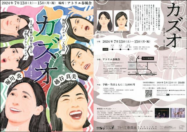 世田谷シルク 二人芝居『カズオ』 24/7/13(土)~24/7/15(月) アトリエ春風舎 シェア ツイート 上演情報 ジャンル 小劇場 上演時間:約2時間(休憩含む)予定 料金 一般-3,000円 全席自由開場時は当日受付順で【劇場支援会員→一般予約→当日券】の順番での入場未就学児は入場不可 キャスト&スタッフ 脚本 永井愛 [脚本]永井愛 [演出]堀川炎 [出演]越谷真美 / 堀川炎 お問い合わせ 世田谷シルク 10:00~18:00 世田谷シルク 公式サイト シェア ツイート