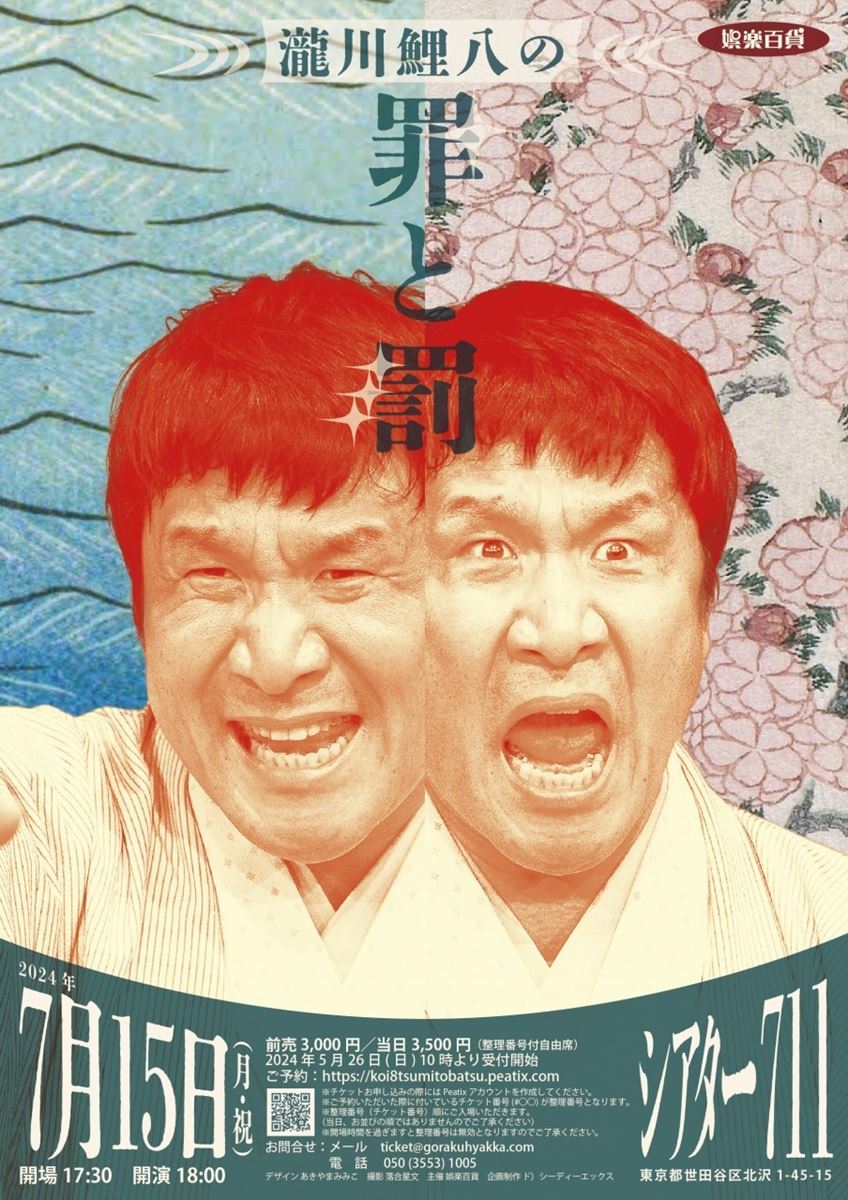 瀧川鯉八の『罪と罰』 24/7/15(月) シアター711 シェア ツイート 上演情報 ジャンル その他古典芸能 料金 一般-3,000円 全席自由・整理番号付一般当日+500円 お問い合わせ 娯楽百貨 娯楽百貨 公式サイト シェア ツイート