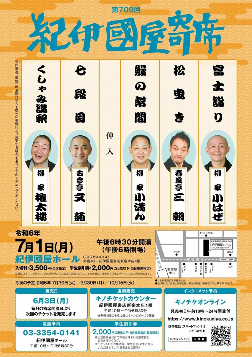 第709回 紀伊國屋寄席 24/7/1(月) 紀伊國屋ホール シェア ツイート 演目柳家小はぜ『富士詣り』春風亭三朝『松曳き』柳家小満ん『鰻の幇間』古今亭文菊『七段目』柳家権太楼『くしゃみ講釈』 上演情報 ジャンル 落語/演芸 料金 一般-3,500円学生割引券-2,000円 全席指定学生割引券:小・中・高・大学生・専門学校生、25歳以下、枚数限定、要学生証提示未就学児は入場不可車いすの方は事前に問い合わせ先まで要連絡 キャスト&スタッフ 出演 柳家小はぜ 春風亭三朝 柳家小満ん [出演]柳家小はぜ / 春風亭三朝 / 柳家小満ん / 他 お問い合わせ 紀伊國屋ホール 公式サイト シェア ツイート