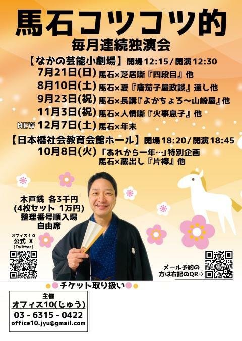 隅田川馬石コツコツ的毎月連続独演会 馬石×夏『唐茄子屋政談』他 24/8/10(土) なかの芸能小劇場 シェア ツイート 上演情報 ジャンル 落語/演芸 料金 一般-3,000円 全席自由・整理番号付 表示できるチケット情報はありません詳しくはこちら キャスト&スタッフ 出演 隅田川馬石 [出演]隅田川馬石 お問い合わせ オフィス10 公式サイト シェア ツイート