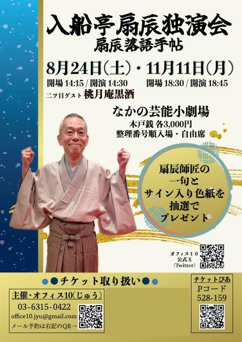 入船亭扇辰独演会~扇辰落語手帖~ 二ツ目ゲスト・桃月庵黒酒 24/8/24(土) なかの芸能小劇場 シェア ツイート 扇辰師匠の独演会!師匠の一句とサイン入り色紙を抽選でプレゼント!8月は二ツ目ゲストで黒酒さんもご登場 上演情報 ジャンル 落語/演芸 チケットに記載の整理番号順に入場で、自由席となります。 料金 一般-3,000円 全席自由・整理番号付 表示できるチケット情報はありません詳しくはこちら キャスト&スタッフ 出演 入船亭扇辰 桃月庵あられ [出演]入船亭扇辰 / 桃月庵黒酒 お問い合わせ オフィス10 公式サイト シェア ツイート