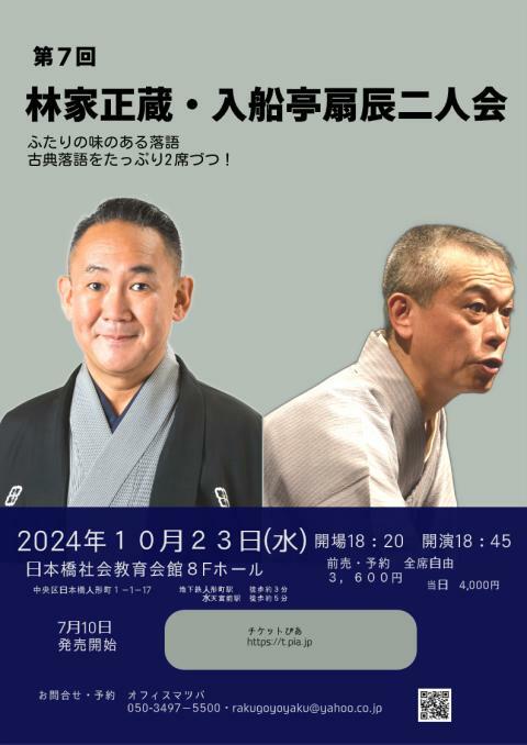 第7回 林家正蔵・入船亭扇辰二人会 24/10/23(水) 日本橋社会教育会館 シェア ツイート 毎年恒例の正蔵と扇辰の二人会です 上演情報 ジャンル 落語/演芸 中止延期以外の払い戻しはおこなっておりませんので、ご了承の上、ご購入ください。 料金 前売-3,600円当日-4,000円 全席自由 表示できるチケット情報はありません詳しくはこちら キャスト&スタッフ 出演 林家正蔵 入船亭扇辰 [出演]林家正蔵 / 入船亭扇辰 お問い合わせ オフィスマツバ 公式サイト シェア ツイート