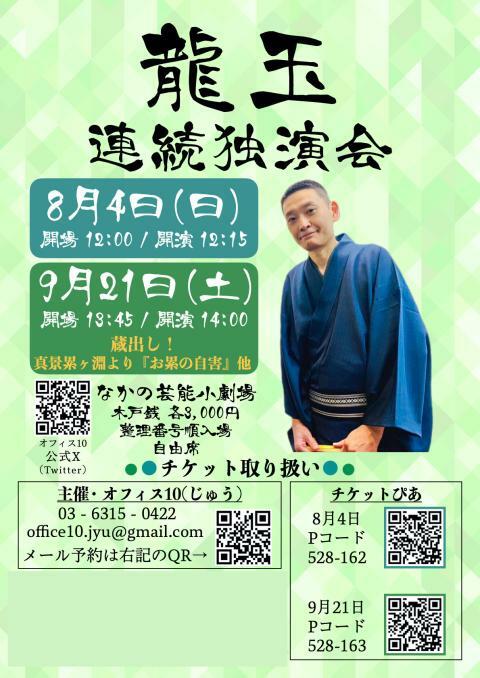 蜃気楼龍玉 連続独演会ー真景累ヶ淵より『お累の自害』他ー 24/9/21(土) なかの芸能小劇場 シェア ツイート 4月に真景累ヶ淵リレーでお久殺しまで口演していただいた続きとなるお累のお噺!蔵出しです! 上演情報 ジャンル 落語/演芸 チケットに記載の整理番号順に入場で、自由席となります。 料金 一般-3,000円 全席自由・整理番号付 表示できるチケット情報はありません詳しくはこちら キャスト&スタッフ 出演 蜃気楼龍玉 [出演]蜃気楼龍玉 お問い合わせ オフィス10 公式サイト シェア ツイート