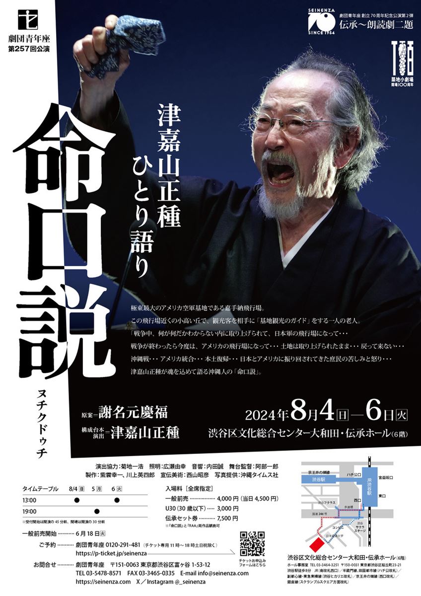 劇団青年座『伝承~朗読劇二題』 津嘉山正種ひとり語り 命口説(ヌチクドゥチ) 24/8/4(日)~24/8/6(火) 渋谷区文化総合センター大和田 伝承ホール シェア ツイート 上演情報 ジャンル 大・中劇場 料金 一般-4,000円U30-3,000円伝承セット券-7,500円 全席指定U30:30歳以下伝承セット券:『命口説』『RAA』両作品観劇可一般当日+500円 キャスト&スタッフ 台本・演出 津嘉山正種 [構成台本・演出]津嘉山正種 お問い合わせ 劇団青年座 青年座映画放送 公式サイト シェア ツイート