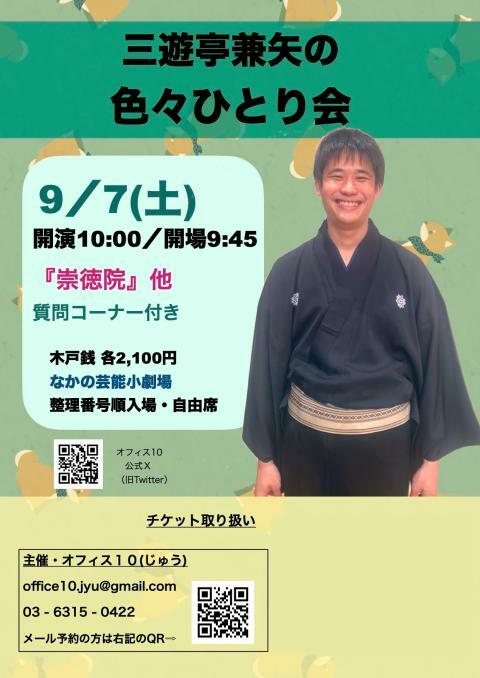 三遊亭兼矢の色々ひとり会 『崇徳院』他、質問コーナー付き 24/9/7(土) なかの芸能小劇場 シェア ツイート 兼矢さんの朝のひとり会!今回は崇徳院をネタ出し!質問コーナー付きです 上演情報 ジャンル 落語/演芸 チケットに記載の整理番号順に入場で、自由席となります。 料金 一般-2,100円 全席自由・整理番号付 表示できるチケット情報はありません詳しくはこちら キャスト&スタッフ 出演 三遊亭兼矢 [出演]三遊亭兼矢 お問い合わせ オフィス10 公式サイト シェア ツイート