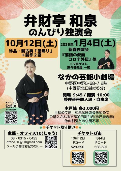 弁財亭和泉のんびり独演会 珍品・新古典『里帰り』+新作2席 24/10/12(土) なかの芸能小劇場 シェア ツイート 5代目春風亭柳昇作の珍しい新古典『里帰り』他です! 上演情報 ジャンル 落語/演芸 チケットに記載の整理番号順に入場で、自由席となります。 料金 一般-3,000円 全席自由・整理番号付 表示できるチケット情報はありません詳しくはこちら キャスト&スタッフ 出演 弁財亭和泉 [出演]弁財亭和泉 お問い合わせ オフィス10 公式サイト シェア ツイート