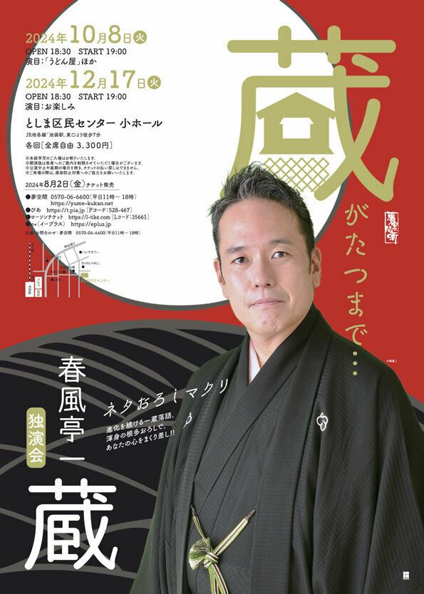 春風亭一蔵 独演会 ~蔵がたつまで・・・~ 24/10/8(火)~24/12/17(火) としま区民センター 小ホール シェア ツイート 上演情報 ジャンル 落語/演芸 公演中止や延期の場合を除き、チケットの払い戻しはできません。ご来場の際は、感染防止対策へのご協力をお願いいたします。開演後は客席へのご案内を制限させていただく場合がございます。 料金 一般-3,300円 全席自由未就学児は入場不可 表示できるチケット情報はありません詳しくはこちら キャスト&スタッフ 出演 春風亭一蔵 [出演]春風亭一蔵 お問い合わせ 夢空間 公式サイト シェア ツイート