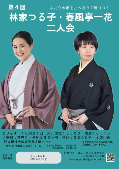 第4回 林家つる子・春風亭一花二人会 24/10/21(月) 日本橋社会教育会館 シェア ツイート 人気のふたり 林家つる子と春風亭一花の二人会です 上演情報 ジャンル 落語/演芸 中止延期以外の払い戻しはおこなっておりませんので、ご了承の上、ご購入ください。 料金 前売-3,300円当日-3,600円 全席自由 表示できるチケット情報はありません詳しくはこちら キャスト&スタッフ 出演 林家つる子 春風亭一花 [出演]林家つる子 / 春風亭一花 お問い合わせ オフィスマツバ 公式サイト シェア ツイート