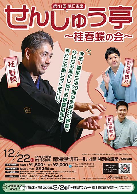 第41回 せんしゅう亭 ~桂春蝶の会~ 24/12/22(日) 南海浪切ホール 4F 特別会議室 シェア ツイート 上演情報 ジャンル 落語/演芸 都合により、出演者が変更になる場合がございます。予めご了承ください。 料金 一般-2,000円 全席自由未就学児童は入場不可 表示できるチケット情報はありません詳しくはこちら キャスト&スタッフ 出演 桂春蝶 笑福亭智丸 笑福亭喬路 [出演]桂春蝶 / 笑福亭智丸 / 笑福亭喬路 お問い合わせ 浪切チケットカウンター 公式サイト シェア ツイート