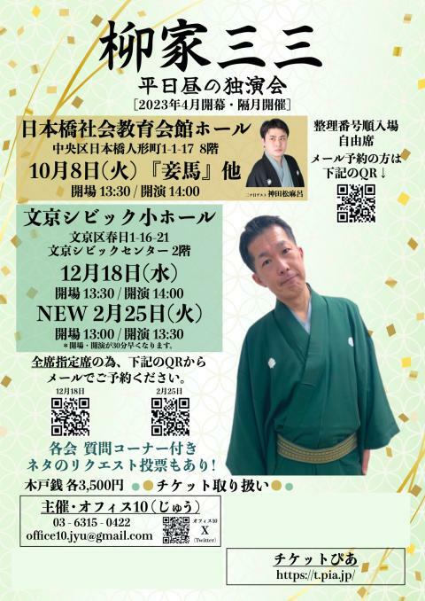 第10回 柳家三三 平日昼の独演会 質問コーナー付き 24/10/8(火) 日本橋社会教育会館 シェア ツイート 10月の平日昼の独演会のネタ出しはリクエスト投票で『妾馬』に!質問コーナー付き! 上演情報 ジャンル 落語/演芸 チケットに記載の整理番号順に入場で、自由席となります。 料金 一般-3,500円 全席自由・整理番号付 表示できるチケット情報はありません詳しくはこちら キャスト&スタッフ 出演 柳家三三 神田松麻呂 [出演]柳家三三 / 神田松麻呂 お問い合わせ オフィス10 公式サイト シェア ツイート