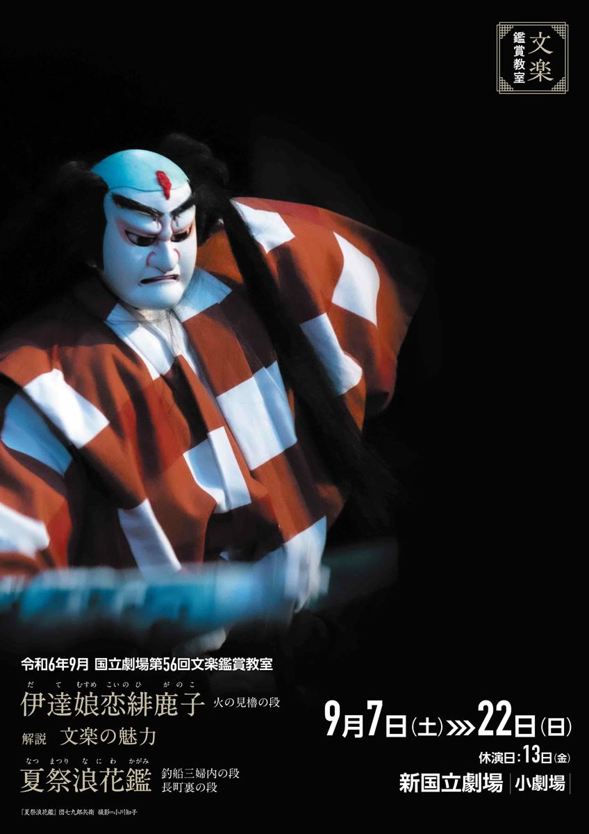 国立劇場 令和6年9月 社会人のための文楽鑑賞教室 24/9/7(土)~24/9/22(日) 新国立劇場 小劇場 シェア ツイート 解説とともに文楽屈指の名作を上演する国立劇場の「文楽鑑賞教室」。『伊達娘恋緋鹿子』と『夏祭浪花鑑』を上演。 【演目】◎伊達娘恋緋鹿子(だてむすめこいのひがのこ)火の見櫓の段◎解説 文楽の魅力◎夏祭浪花鑑(なつまつりなにわかがみ)釣船三婦内の段・長町裏の段 上演情報 ジャンル 文楽 上演時間:約2時間10分 字幕アプリ使用。各部休憩あり。 料金 一般-6,000円 全席指定 表示できるチケット情報はありません詳しくはこちら お問い合わせ 国立劇場チケットセンター 公式サイト シェア ツイート