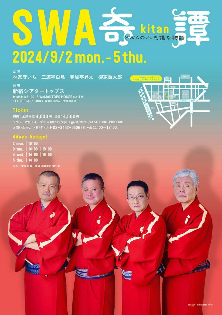 SWA クリエイティブツアー『SWA 奇譚 SWAの不思議な物語』 24/9/2(月)~24/9/5(木) 新宿シアタートップス シェア ツイート 上演情報 ジャンル 落語/演芸 料金 前売-4,000円当日-4,500円 全席指定 キャスト&スタッフ 出演 林家彦いち 三遊亭白鳥 春風亭昇太 柳家喬太郎 [出演]林家彦いち / 三遊亭白鳥 / 春風亭昇太 / 柳家喬太郎 お問い合わせ (有)ティルト 11:00~18:00・土日祝休 公式サイト シェア ツイート
