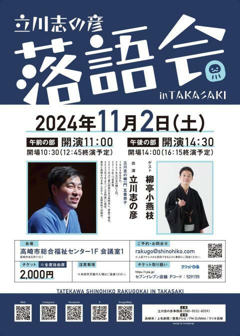 立川志の彦落語会 in 高崎 24/11/2(土) 高崎市総合福祉センター 会議室1 シェア ツイート 立川志の彦による高崎での定期公演。 上演情報 ジャンル 落語/演芸 未就学児童は入場不可。 料金 一般-2,000円 全席自由 表示できるチケット情報はありません詳しくはこちら キャスト&スタッフ 出演 立川志の彦 柳亭市弥 [出演]立川志の彦 / 柳亭小燕枝 お問い合わせ 立川志の彦事務局 公式サイト シェア ツイート