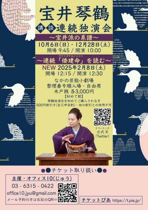 宝井琴鶴 連続独演会ー宝井派の系譜ー 24/10/6(日) なかの芸能小劇場 シェア ツイート 宝井派ゆかりのネタを毎回1席! 宝井派の系譜の企画は10月を入れて残り2回です! 上演情報 ジャンル 落語/演芸 チケットに記載の整理番号順に入場で、自由席となります。 料金 一般-3,000円 全席自由・整理番号付 表示できるチケット情報はありません詳しくはこちら キャスト&スタッフ 出演 宝井琴柑 [出演]宝井琴鶴 お問い合わせ オフィス10 公式サイト シェア ツイート