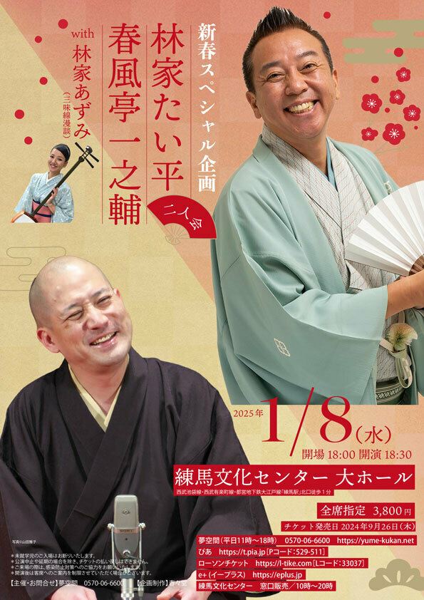 新春スペシャル企画 林家たい平・春風亭一之輔 二人会 with 林家あずみ 25/1/8(水) 練馬文化センター 大ホール(こぶしホール) シェア ツイート 上演情報 ジャンル 落語/演芸 公演中止や延期の場合を除き、チケットの払い戻しはできません。ご来場の際は、感染防止対策へのご協力をお願いいたします。開演後は客席へのご案内を制限させていただく場合がございます。 料金 一般-3,800円 全席指定未就学児は入場不可 表示できるチケット情報はありません詳しくはこちら キャスト&スタッフ 出演 林家たい平 春風亭一之輔 林家あずみ [出演]林家たい平 / 春風亭一之輔 / 林家あずみ / 他 お問い合わせ 夢空間 公式サイト シェア ツイート