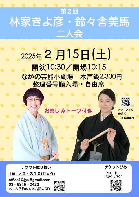 第2回 林家きよ彦・鈴々舎美馬 二人会 お楽しみトーク付き 25/2/15(土) なかの芸能小劇場 シェア ツイート 上演情報 ジャンル 落語/演芸 チケットに記載の整理番号順に入場で、自由席となります。 料金 一般-2,300円 全席・整理番号付 表示できるチケット情報はありません詳しくはこちら キャスト&スタッフ 出演 林家きよひこ 鈴々舎美馬 [出演]林家きよ彦 / 鈴々舎美馬 お問い合わせ オフィス10 公式サイト シェア ツイート