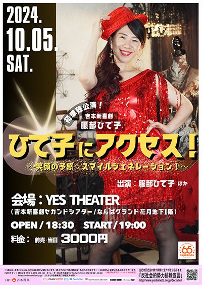 初単独公演 服部ひで子の『ひで子にアクセス!~笑顔の予感☆スマイルジェネレーション!~』 24/10/5(土) YES THEATER シェア ツイート 上演情報 ジャンル お笑い 料金 一般-3,000円 全席指定5歳以上は有料4歳以下はひざ上のみ無料、席が必要な場合は有料16歳未満は、要保護者同伴車椅子の方は購入前にFANYチケット問合せダイヤルまで要問合せ キャスト&スタッフ 出演 服部ひで子 [出演]服部ひで子 / 他 お問い合わせ FANYチケット問合せダイヤル (チケットに関するお問い合わせ)10:00~19:00 公式サイト シェア ツイート