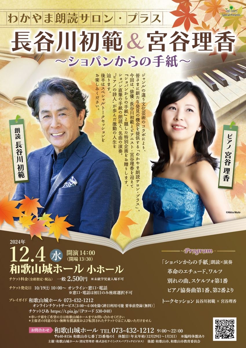 長谷川初範&宮谷理香~ショパンからの手紙~ 24/12/4(水) 和歌山城ホール 小ホール シェア ツイート すべての写真(2)を見る すべての写真(2)を見る 上演情報 ジャンル 小劇場 料金 一般-2,500円 全席指定未就学児入場不可車いすの方は会館事務所にお電話にて要連絡 表示できるチケット情報はありません詳しくはこちら キャスト&スタッフ 出演 長谷川初範 宮谷理香 [出演]長谷川初範(朗読) / 宮谷理香(ピアノ) お問い合わせ 和歌山城ホール 9:00~22:00 公式サイト シェア ツイート