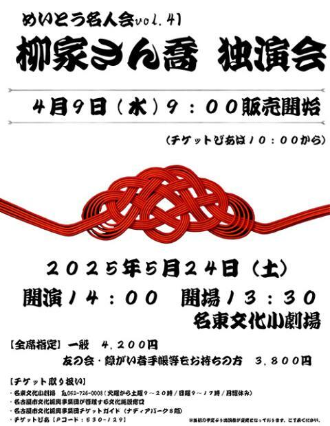 めいとう名人会vol.41『柳家さん喬 独演会』 25/5/24(土) 名古屋市名東文化小劇場 シェア ツイート 上演情報 ジャンル 落語/演芸 ※当初はめいとう名人会vol.41「柳家さん喬・柳家権太楼 二人会」を開催予定でしたが、「柳家さん喬 独演会」に変更となりました。 料金 一般-4,200円 全指定席未就学児童は入場不可 表示できるチケット情報はありません詳しくはこちら キャスト&スタッフ 出演 柳家さん喬 [出演]柳家さん喬 お問い合わせ 名古屋文化振興事業団[名東文化小劇場] 公式サイト シェア ツイート