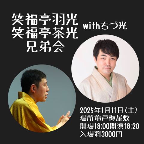笑福亭羽光笑福亭茶光兄弟会withちづ光 25/1/11(土) 亀戸梅屋敷 シェア ツイート 笑福亭羽光笑福亭茶光二人会です。トークコーナーあり。 上演情報 ジャンル 落語/演芸 料金 一般-3,000円 全席自由 表示できるチケット情報はありません詳しくはこちら キャスト&スタッフ 出演 笑福亭羽光 笑福亭茶光 笑福亭ちづ光 [出演]笑福亭羽光 / 笑福亭茶光 / 笑福亭ちづ光 お問い合わせ 独演会.com 公式サイト シェア ツイート