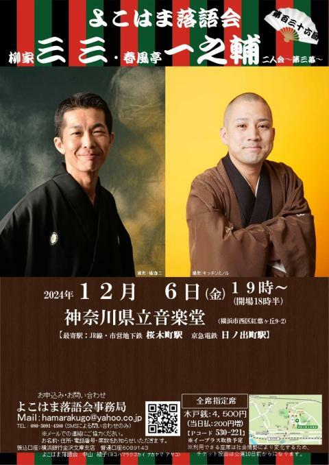 柳家三三・春風亭一之輔 二人会 ~よこはま落語会~ 24/12/6(金) 神奈川県立音楽堂(木のホール) シェア ツイート 落語協会きっての若手真打の共演です 上演情報 ジャンル 落語/演芸 感染症対策に協力ください。公演の中止以外、いかなる事情の場合も払い戻しは行えません。車椅子座席希望のお客様は主催者から直接ご購入ください。こちらでは車椅子座席の購入はできません。購入後の座席位置変更もできません。爆笑予定のお客様には周囲のお客様の安心のためマスク着用を推奨します。チケット現券の持参がない場合、入場することはできません。 料金 前売-4,500円当日-4,700円 全席指定 表示できるチケット情報はありません詳しくはこちら キャスト&スタッフ 出演 柳家三三 春風亭一之輔 [出演]柳家三三 / 春風亭一之輔 お問い合わせ よこはま落語会【はまらくご】事務局 公式サイト シェア ツイート