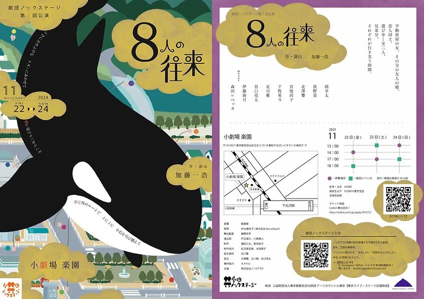 劇団ノックステージ『8人の往来』 24/11/22(金)~24/11/24(日) 小劇場楽園 シェア ツイート 上演情報 ジャンル 小劇場 料金 一般-4,000円高校生以下-3,000円 全席自由高校生以下:要学生証提示 キャスト&スタッフ 作・演出 加藤一浩 出演 北澤響 [作・演出]加藤一浩 [出演]岡幸太 / 荻野栞 / 北澤響 / 他※一部Wキャスト。公演日時によって出演者が異なります。詳細は公式サイトにてご確認下さい。 お問い合わせ 劇団ノックステージ 公式サイト シェア ツイート