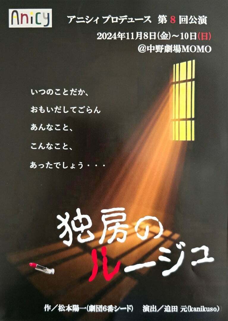 Anicyプロデュース『独房のルージュ』 24/11/8(金)~24/11/10(日) 劇場MOMO シェア ツイート すべての写真(2)を見る すべての写真(2)を見る 上演情報 ジャンル 小劇場 料金 一般-3,500円A・Bセットチケット-6,000円 全席自由未就学児は入場不可 キャスト&スタッフ 作 松本陽一 [作]松本陽一 [演出]迫田元 [出演]宗岡里歩 / 柿本亜紀 / 大塩駿平 / 田村廉太郎 / 他※Wキャスト、公演日時によって出演者が異なります、詳細は公式サイトをご確認ください お問い合わせ Anicyプロデュース(ヤマシタ) Anicyプロデュース(ヤマシタ) 公式サイト シェア ツイート