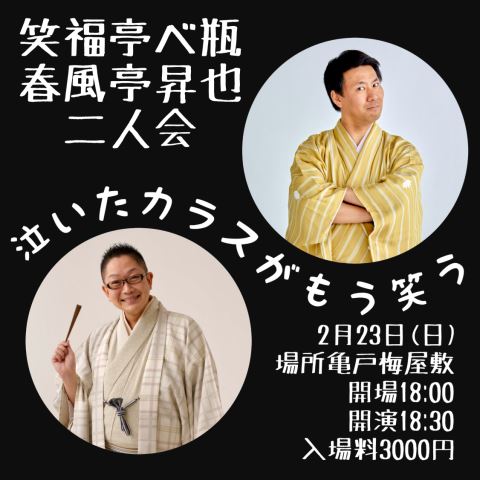 笑福亭べ瓶春風亭昇也二人会~泣いたカラスがもう笑う~ 25/2/23(日) 亀戸梅屋敷 シェア ツイート 笑福亭べ瓶春風亭昇也二人会です。トークコーナーあり(長め) 上演情報 ジャンル 落語/演芸 料金 一般-3,000円 全席自由 表示できるチケット情報はありません詳しくはこちら キャスト&スタッフ 出演 笑福亭べ瓶 春風亭昇也 笑福亭ちづ光 [出演]笑福亭べ瓶 / 春風亭昇也 / 笑福亭ちづ光 お問い合わせ 独演会.com 公式サイト シェア ツイート