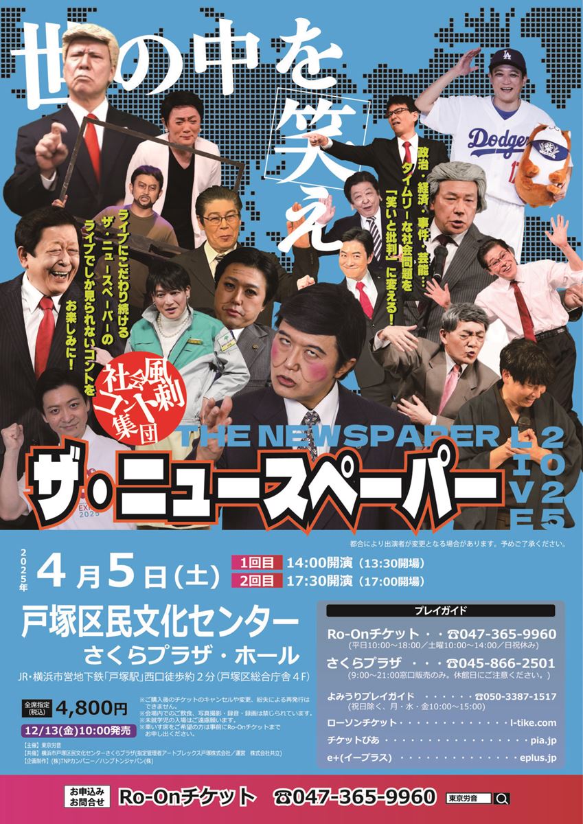 社会風刺コント集団 ザ・ニュースペーパーLIVE 2025 25/4/5(土) 戸塚区民文化センター さくらプラザ ホール シェア ツイート 上演情報 ジャンル お笑い 料金 一般-4,800円 全席指定未就学児童は入場不可車いすの方はチケット購入前に問合せ先まで要連絡 表示できるチケット情報はありません詳しくはこちら キャスト&スタッフ メイン ザ・ニュースペーパー お問い合わせ Ro-On チケット 公式サイト シェア ツイート