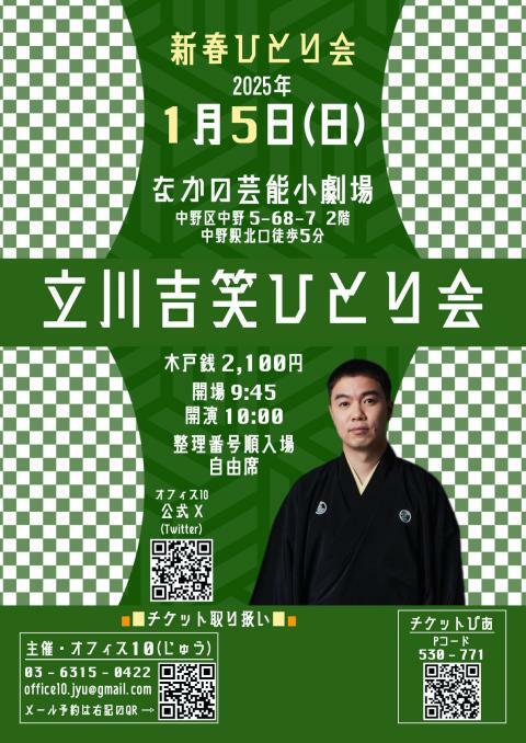 第18回 立川吉笑 新春ひとり会 25/1/5(日) なかの芸能小劇場 シェア ツイート 上演情報 ジャンル 落語/演芸 料金 一般-2,100円 全席自由・整理番号付 表示できるチケット情報はありません詳しくはこちら キャスト&スタッフ 出演 立川吉笑 [出演]立川吉笑 お問い合わせ オフィス10 公式サイト シェア ツイート