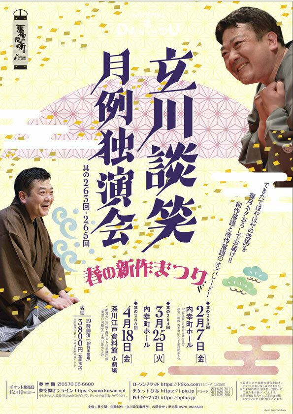 立川談笑 月例独演会 其の263回~ 春の新作まつり ~ 25/2/7(金) 千代田区立内幸町ホール シェア ツイート 上演情報 ジャンル 落語/演芸 公演中止や延期の場合を除き、チケットの払い戻しはできません。ご来場の際は、感染防止対策へのご協力をお願いいたします。開演後は客席へのご案内を制限させていただく場合がございます。 料金 一般-3,800円 全席指定未就学児童は入場不可 表示できるチケット情報はありません詳しくはこちら キャスト&スタッフ メイン 立川談笑 お問い合わせ 夢空間 公式サイト シェア ツイート