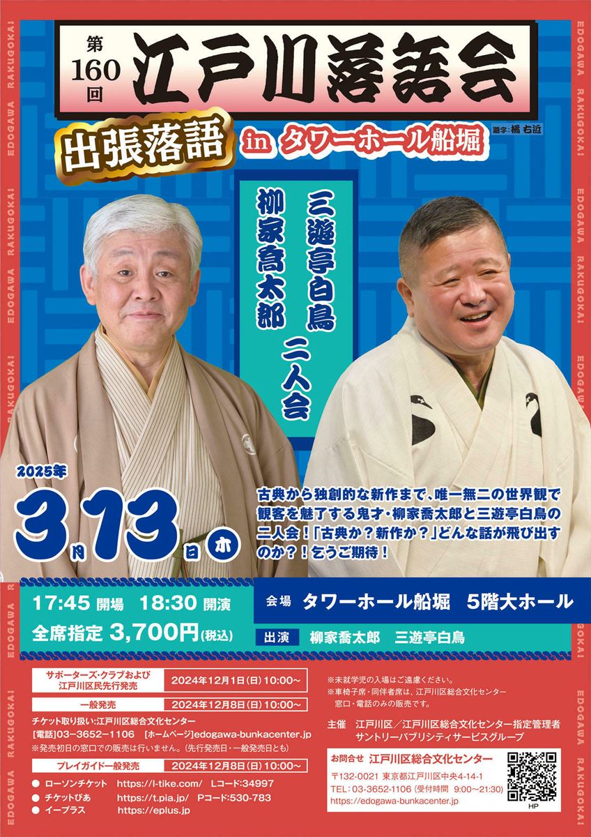 第160回江戸川落語会 25/3/13(木) タワーホール船堀 大ホール シェア ツイート 人気落語家、柳家喬太郎と三遊亭白鳥による二人会。 上演情報 ジャンル 落語/演芸 料金 一般-3,700円 全席指定未就学児は入場不可車椅子・同伴者席は江戸川区総合文化センター窓口・電話のみの販売です 表示できるチケット情報はありません詳しくはこちら キャスト&スタッフ 出演 柳家喬太郎 三遊亭白鳥 [出演]柳家喬太郎 / 三遊亭白鳥 お問い合わせ 江戸川区総合文化センター 9:00~21:30 公式サイト シェア ツイート