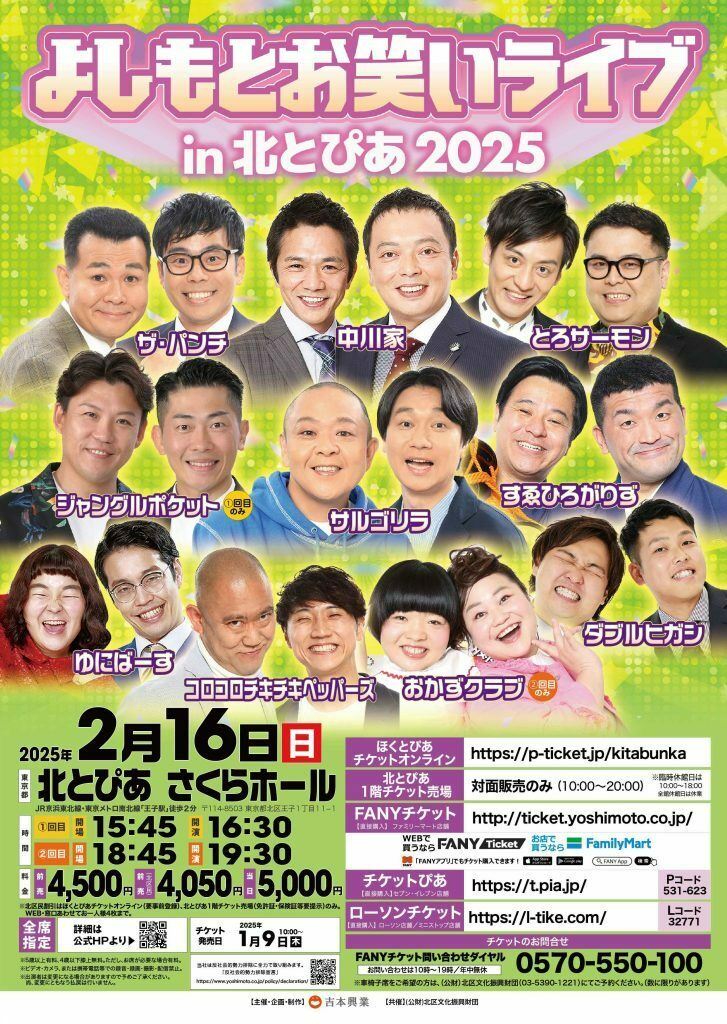 よしもとお笑いライブin北とぴあ2025 25/2/16(日) 北とぴあ さくらホール シェア ツイート すべての写真(2)を見る すべての写真(2)を見る 上演情報 ジャンル お笑い 料金 前売-4,500円当日-5,000円 全席指定5歳以上は有料4歳以下はひざ上のみ無料、但し、席が必要な場合は有料車いすの方はチケット購入前に公益財団法人北区文化振興財団まで要連絡 表示できるチケット情報はありません詳しくはこちら キャスト&スタッフ 出演 中川家 すゑひろがりず コロコロチキチキペッパーズ ゆにばーす ダブルヒガシ おかずクラブ ザ・パンチ とろサーモン サルゴリラ ジャングルポケット お問い合わせ FANYチケット問合せダイヤル 公益財団法人北区文化振興財団 公式サイト シェア ツイート