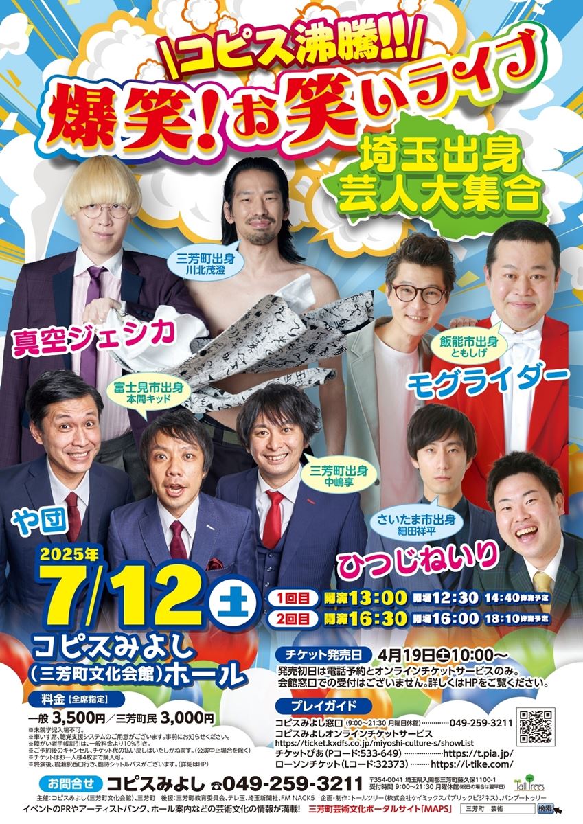 コピス沸騰!!爆笑!お笑いライブ~埼玉出身芸人大集合~ 25/7/12(土) コピスみよし(三芳町文化会館) シェア ツイート 上演情報 ジャンル お笑い ※営利目的による転売禁止及び、転売券での入場不可 料金 一般-3,500円 全席指定三芳町民割あり未就学児入場不可 表示できるチケット情報はありません詳しくはこちら キャスト&スタッフ 出演 真空ジェシカ モグライダー や団 ひつじねいり [出演]真空ジェシカ / モグライダー / や団 / ひつじねいり お問い合わせ コピスみよし 公式サイト シェア ツイート