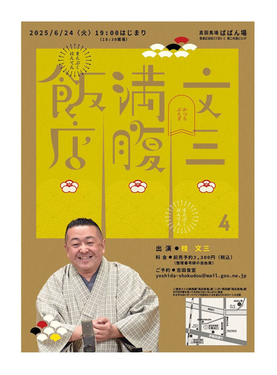 文三満腹飯店4 25/6/24(火) ばばん場 シェア ツイート 上演情報 ジャンル 落語/演芸 料金 前売:3,300円 ※整理番号順の自由席 キャスト&スタッフ 出演 桂文三 お問い合わせ 予約 公式サイト シェア ツイート